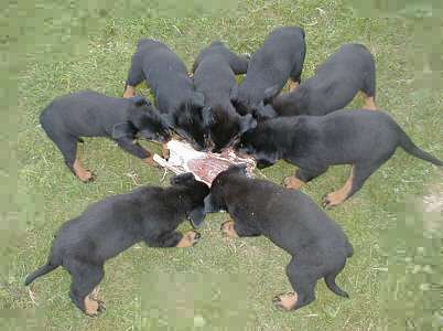Et surtout, surtout, qui n'a jamais vu son chien "travailler" une pièce de boeuf, une panse ou une carcasse de dinde, ne sait pas où est le seul vrai plaisir de notre meilleur ami. Nous élevons la cuisine au rang de l'art, mais nous refusons de croire que le chien aime manger. Les livres disent que la ration doit être variée dans sont contenu mais immuable dans sa présentation. Mais tout cela est bien théorique! Le chien est carnivore à tendance omnivore = Oui, le chien aime manger de tout (presque tout), cru et frais. Et il s'en est toujours bien porté.
