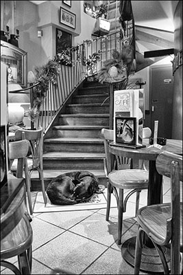 Ce bar (à droite) est fermé. On imagine facilement que rempli de clientèle, imposer cette place au chien serait une source de stress énorme et permanente.