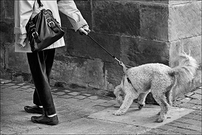Laisser le chien marcher le long des murs ne peut que lui faire constamment baisser la truffe à la découverte de toutes ces odeurs. Le faire marcher bien à gauche, côté rue, aiderait probablement à la fluidité de la promenade en diminuant la pression qui pèse sur le chien et sur son maître.